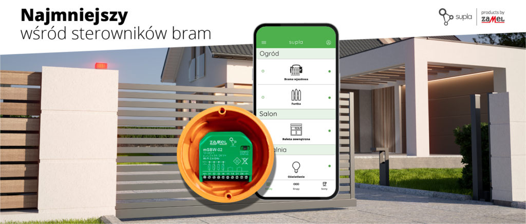 Poznaj najmniejszy wśród sterowników bram Supla by Zamel! Sterownik bramowy mSBW-02 pozwala na integrację z dowolnym napędem bramowym oraz furtką i umożliwia zdalną kontrolę bramy poprzez aplikację mobilną Supla. Urządzenie przystosowane jest do montażu bezpośrednio w napędzie. Dzięki uniwersalnemu zasilaniu 12÷24 V można go wykorzystać w wielu aplikacjach. Podłączając sygnały z wyłączników krańcowych pod wejścia sterownika otrzymujemy informację o otwarciu lub zamknięciu bramy / furtki.